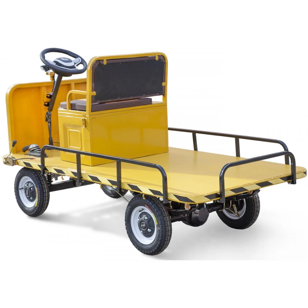 Платформа размерами 2100 x 1000 мм изготовлена к высокопрочной стали, рассчитана на продолжительную эксплуатацию без потери первоначальных характеристик при максимальных нагрузках до 1000 Вт. Электрокар оснащен мощным электродвижком на 1200 Вт способным развит скоростные параметры до 25 км/час. Накатистые колеса отлично сцепляются с поверхностью, способны преодолевать подъемы до 15 градусов.